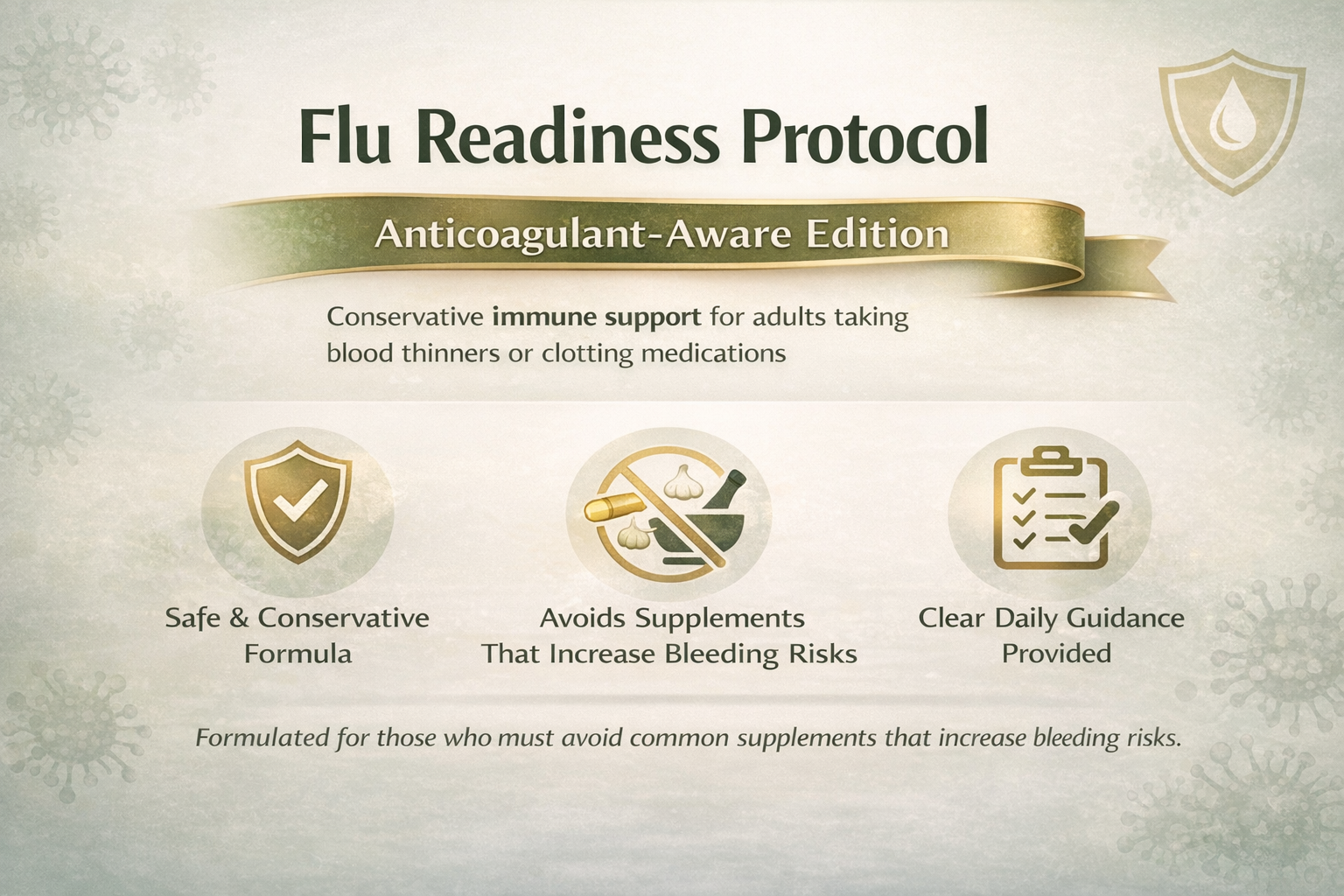 This purchase includes the recommended pharmaceutical-grade supplement stack specifically selected for individuals who take blood thinners or medications that affect bleeding or clotting. The Living Proof Flu Readiness Protocol โ Anticoagulant-Aware Edition is included at no additional cost to provide clear, conservative guidance on how to use this stack as intended.